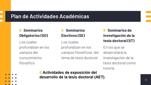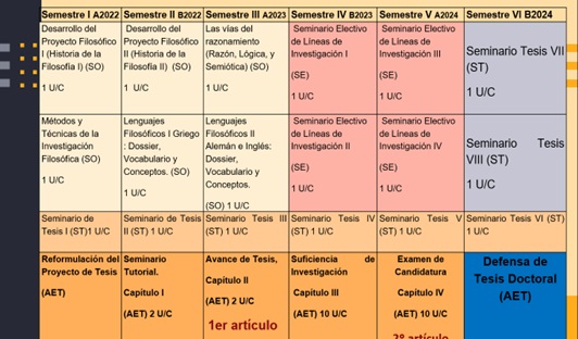 - Sexto semestre: Defensa pública del proyecto de tesis. Para el momento de la Defensa de la Tesis el doctorando debe tener aprobados un mínimo de cuarenta y cinco (45) unidades crédito.